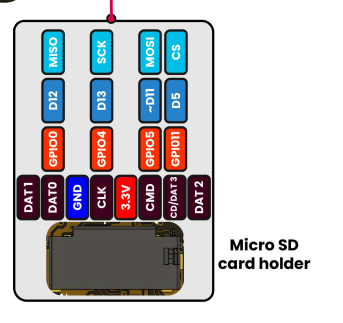 The microSD card is connected via SPI interface using 4 wires (MOSI, MISO, SCK, CS)